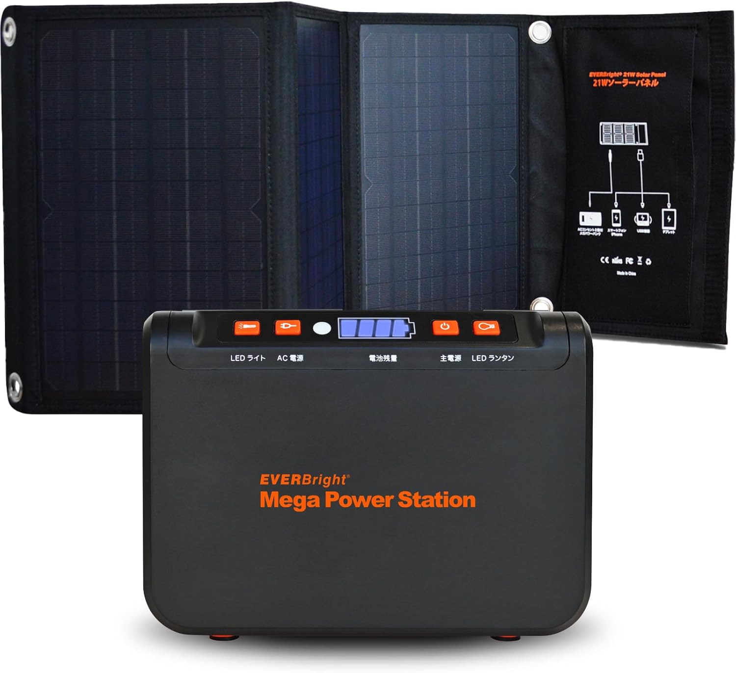 EVERBright メガパワーステーション ポータブル電源 + 21Wソーラーパネル スマホ8回分の充電が可能